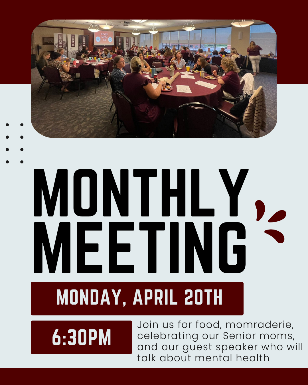 We welcome ALL moms of current and past students to join our club and support our Aggie Students. We will have a potluck at our monthly meetings and host fun and charitable events such as our Chili Cook-off, Big Event Luncheon and much more! Join us at our upcoming meeting.