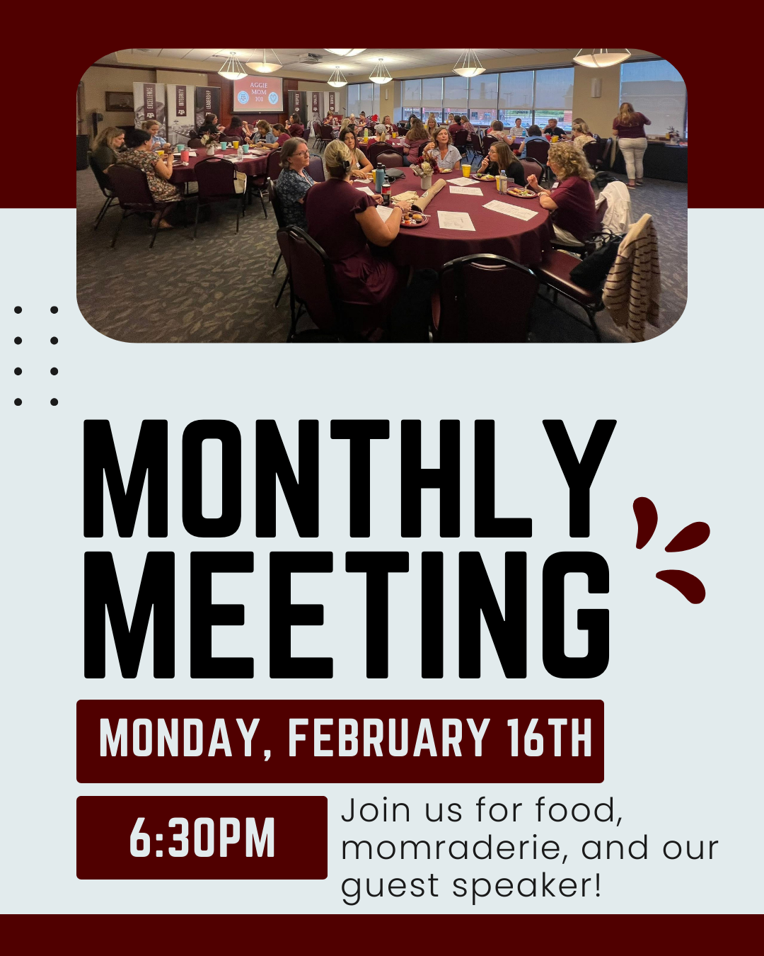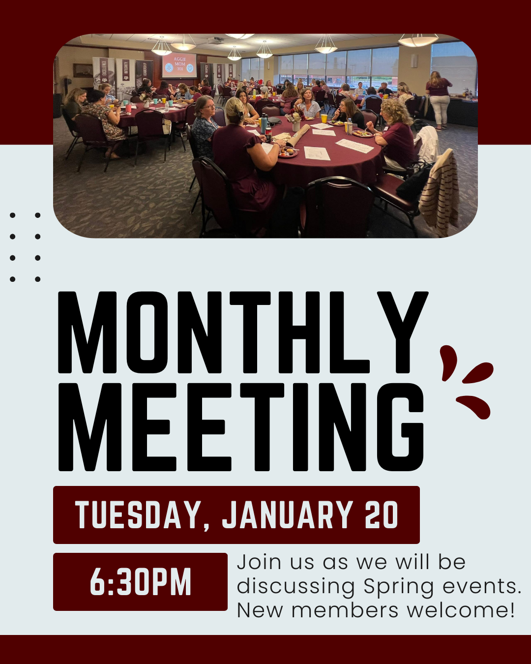 Howdy Aggie moms! We welcome all moms of current and past students to join our club and support our Aggie Students. We will have a potluck at our monthly meetings and host fun and charitable events such as our Chili Cook-off, Big Event Luncheon and much more!