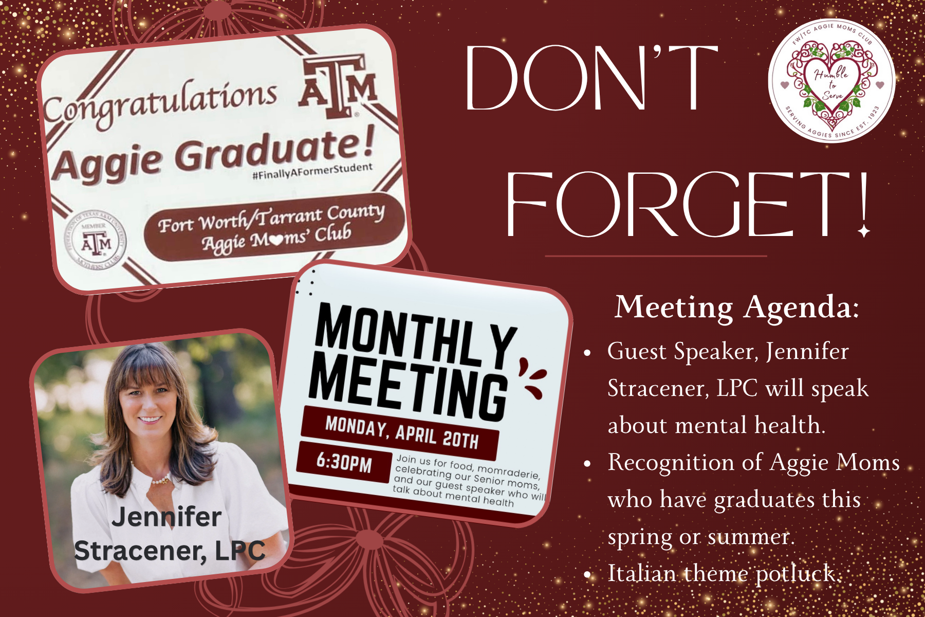 Join us for our last general meeting of the year on Monday, April 20th at 6:30 p.m. Our potluck theme is Italian food. A signup link for the food can be found below. We will also be recognizing those Aggie Moms who have a Senior graduating this Spring or Summer and welcome them into the Ring of Honor Moms.