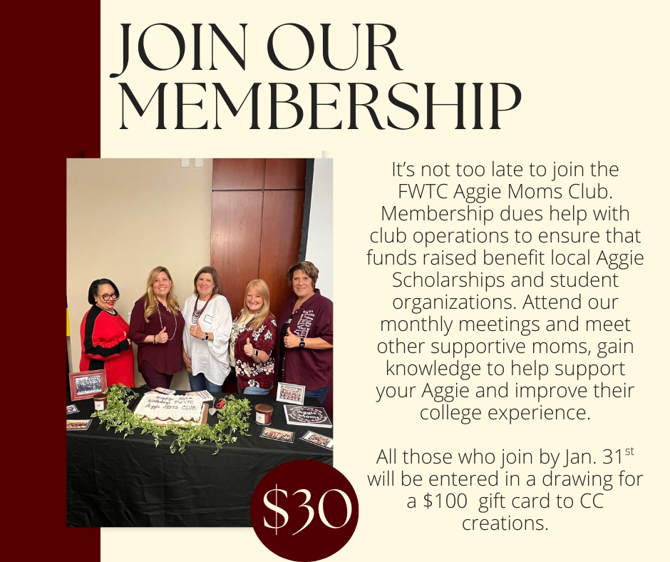 As a member you can attend our monthly member meetings with a supportive network of Aggie Moms and gain valuable insight through our programs. We help to provide resources and assistance to our Aggie Students to help them have enriching college experience during their time at A&M. You can also receive special Aggie Mom discount offers for our goody bags. Please join us if you have not already!